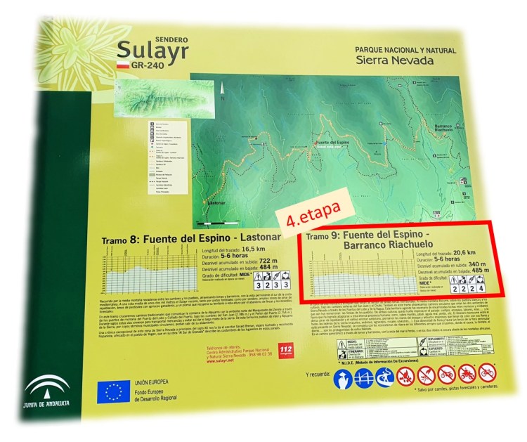 - Já: „Jdeme po GR240 – Sulayr trailu, právě jsme na rozcestí 6 km od Fuente del Espino a je tady cedule, která říká, že do 4 odpoledne je na stezku zakázán vstup a my nevíme proč.“