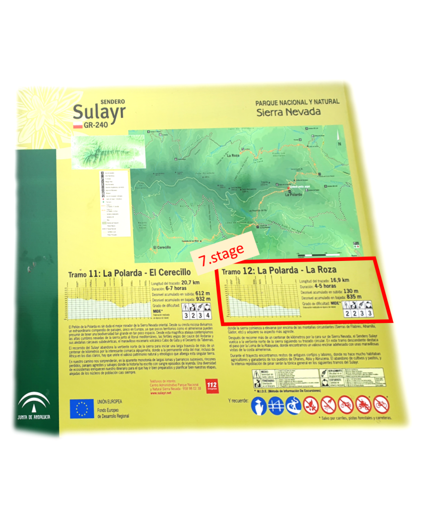 La Roza campsite is a pleasant surprise. It’s also the end of another official trail stage. There is no pub and no one around but there is a toilette and running water. Furthermore, there are camp tables, barbeques on which setting up a fire is prohibited (#makessense), playing field and jungle gym for kids. All is free of charge and available through the whole year. The camp was probably established together with the trail. We also appreciate its strategic location – there is a small town called Abrucena just 5 km down the road. We plan to go there tomorrow in order to resupply. Given its proximity to civilization and the parking possibility at La Roza, it could be considered as an additional suitable starting point for the Sulayr trail (even though it is not an official one).
