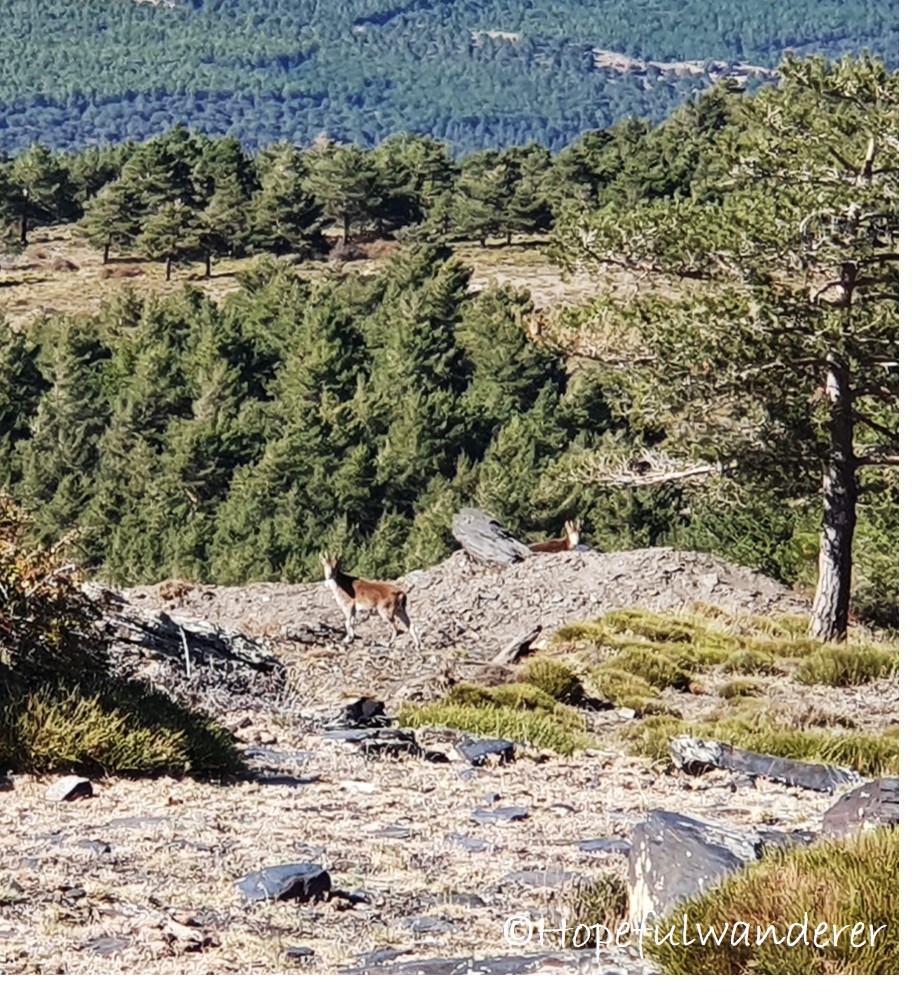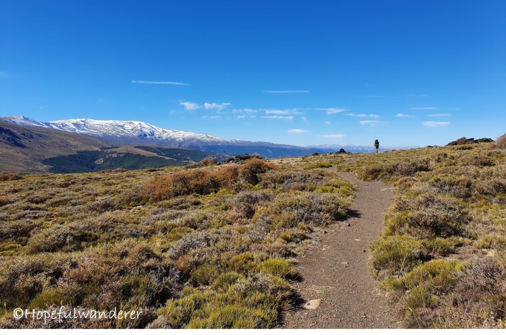 Po krátké siestě vyrážíme dál na trail. Procházíme okolo stáda koní a později narážíme na další rodinku divokých koz. Přestože je to už asi desáté setkání s kozami, pokaždé, když je vidím, jsem znovu a znovu u vytržení. Vlastně jsem nadšená vždy, když potkám zvíře ve volné přírodě. Asi po 1 km od informačního centra se před námi v celé své majestátnosti zjeví Pico de Mulhacén, který je se svými 3,483 m.n.n nejvyšší horou Sierra Nevady. Dnes si díky perfektnímu počasí můžeme opět užívat dech-beroucí kontrast zasněžených vrcholů za teplého prosluněného dne. Nemůžu se toho pohledu nabažit. Připomíná mi, proč jsme se sem vydali a proč si takových pohledů chci užívat v nedaleké budoucnosti víc a víc.