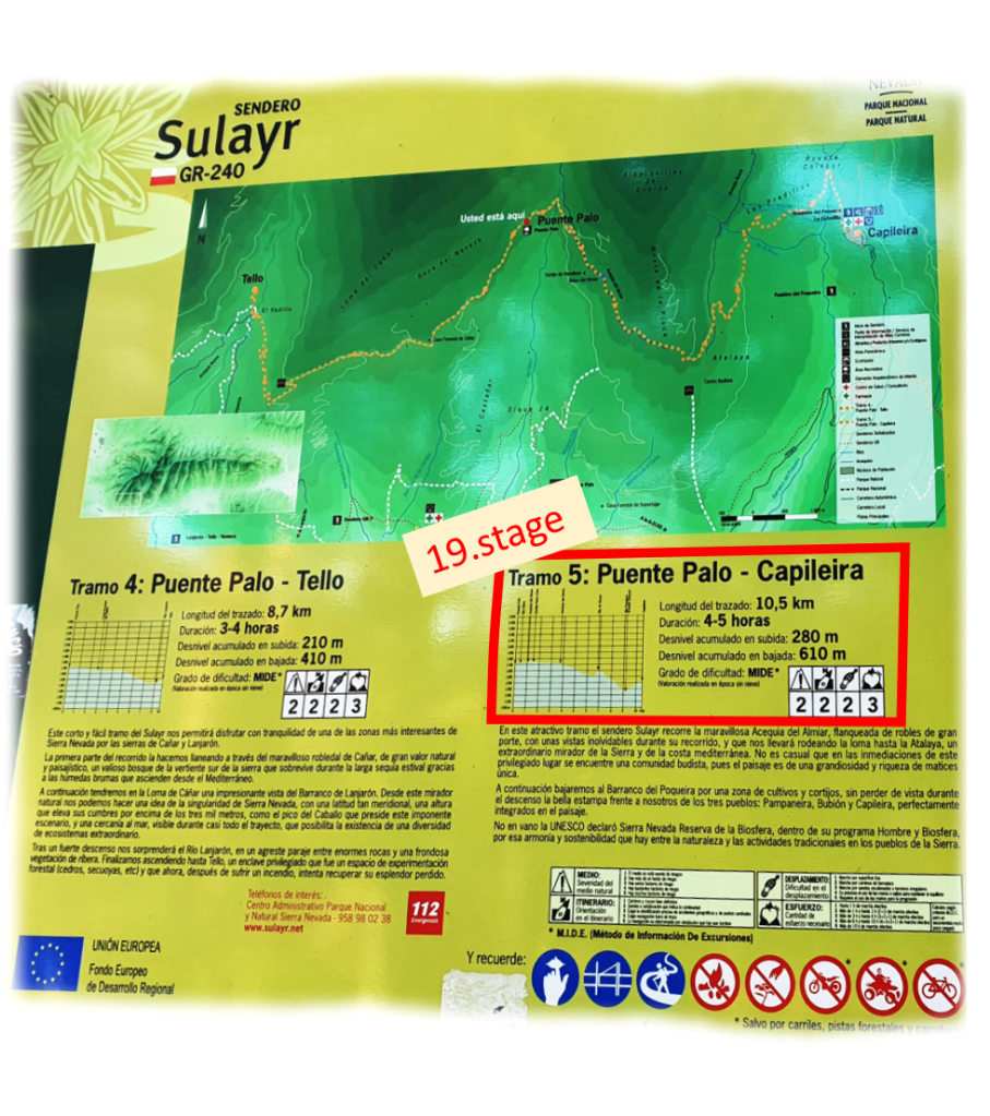 A then finally….FINALLY…I can see the final notice board. The very last yellow and green notice board placed at border of Capileira. We made it! 315 km, 16 days – the whole Sulayr trail…DONE! And it was totally worth it. Now only the pleasant stuff awaits – load up with juice and chocolate, find a restaurant with outdoor seating, load up with proper food, check in at a hostel, shower, sleep and repeat.