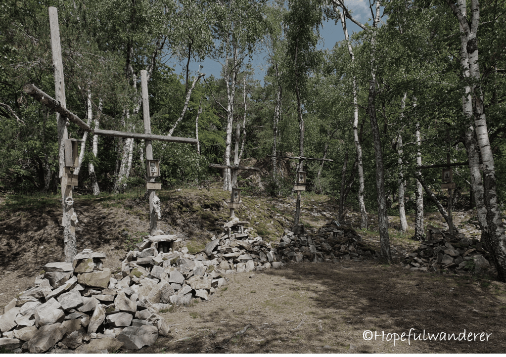 We slept at a very odd campsite back then in the forests above a Czech village called Řevnice. There were remains of a tramp camp with fireplace and blood-red sign on the adjacent rock – “The slaves of memories“. In addition, there were many big wooden crosses standing nearby – basically the place looked like a (symbolical?) cemetery. The crosses were there to commemorate the tramps. Each had a photograph and marker with few words about the person. In the daylight, it looked still OK and so we decided to stay. I remember trying to convince myself that the place actually has a positive vibe, that those tramps must have loved it there and that they certainly created many nice memories there….