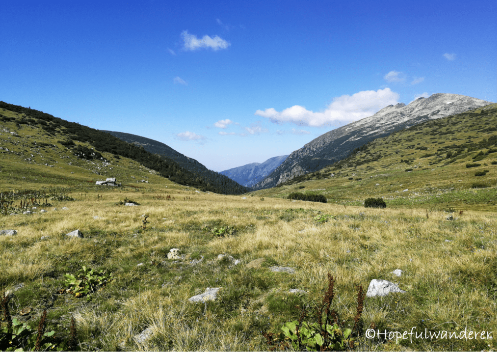 Vzhledem k tomu, že jsme si včerejší etapu výrazně zkrátili, máme dnes před sebou o “pár” kilometrů navíc. Cílem je chata Ribni Ezera. První zastávka – Kobilino Branishte. To se nachází na dně údolí, k němuž směřuje pěšinka vedoucí přes rozlehlou travnatou pláň. Žádné kobyly tam nebyly, za to tam byla útulná chatička, kde bychom bývali mohli přenocovat, kdybychom tam teda včera došli. Ale kdo by chtěl spát v chatě, když může mrznout a trnout strachy ve stanu, že jo?