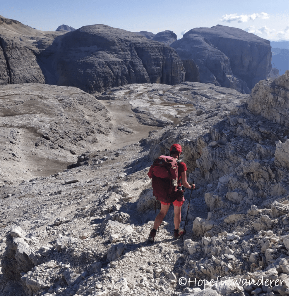 Od chaty Forcella Pordoi slézáme až k silnici klikatící se průsmykem Passo Pordoi, který představuje hranici mezi provinciemi Trento a Belluno. Odtud následně zase vylézáme zase nahoru, procházíme lanovkovým komplexem a po panoramatické cestě s haldou turistů pokračujeme až na chatu Rif Viel del Pan. Její jméno mě opravdu pobavilo. Při zkombinování němčiny, italštiny a španělštiny bych řekla, že jde o chatu “Hodně chleba”. Jestli tam opravdu měli hodně chleba, to nevíme, rozhodně tam měli hodně lidí. Vlastně tolik, že nás to odradilo od jakéhokoli pomyšlení na zastavení se zde.