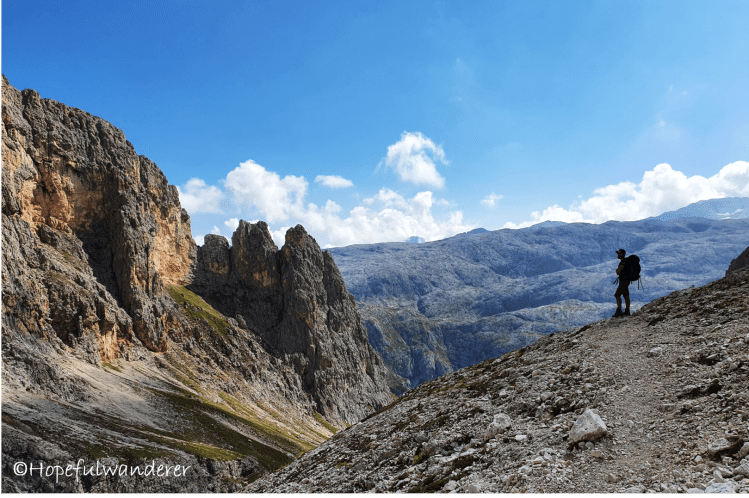 We’re out of water again and are incredibly thirsty…also nothing new under the sun. Luckily, since there’s a refugio almost at every corner, we soon reach one¨ (Rifugio Volpi al Mulaz). After we hydrate (limón-soda is a must), we also buy a bottle of water for a poor thirsty doggo who arrived to the refugio with his master – an old mountaineer. The man bought himself a beer but didn’t bring anything for the doggo who was apparently extremely thirsty. His name was Max and he drank a good half of the 2 liter bottle we bought for him. The old man thanked us and off they went.
