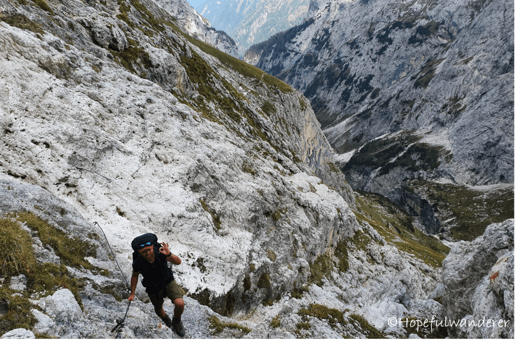 Na cestě z refugia hodím pěknýho placáka na šutry. Naštěstí přistávám hladce, a tak se to obejde bez většího zranění. Ještě chvíli zůstávám rozpláclá na zemi a směju se. Smějeme se tomu ještě i po cestě. Dobrá nálada nás ale brzy přechází. Evidentně máme před sebou další šílený ferratový úsek. Kus před námi putuje skupinka lidí, tak vidíme, kam zas budeme lozit. Než nastoupíme na ferratu, musíme počkat až ti před námi dolezou na vrchol. Pod nohama jim totiž podkluzují kameny a ty padají naším směrem.