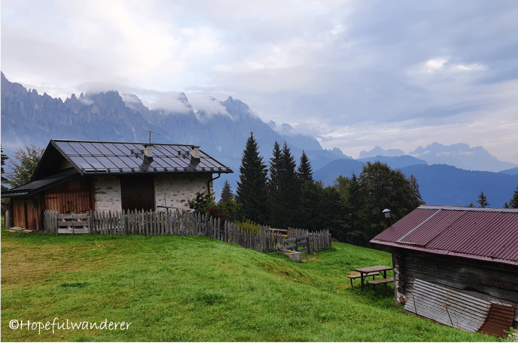 Procházíme zvláštní, z větší části opuštěnou (nebo minimálně hodně vylidněnou) osadou v Passo Cereda. Název je vcelku trefný, neb je opravdu docela šeredná :). Míjíme i další rifugio. I když nemáme nejmenší potuchu, kde strávíme dnešní noc, do rifugia se nehrneme. Ne, že bychom snad pohrdli střechou nad hlavou a teplou sprchou…ale odrazují nás proti-covidová opatření (např. nutnost zakoupení jednorázového povlečení či obalu na spacák), která by celý pobyt zkomplikovala a prodražila. Já osobně už bych se ráda někde utábořila. To ale nebude tak jednoduchý. Před námi je totiž několikakilometrový úsek lesní zpevněné cesty. Na jedné straně se tyčí prudký svah, na druhé straně je sráz. Když už se sem tam najde nějaká rovinka, je na ní z cesty nebezpečně moc vidět. Nezbývá než zatnou zuby a kráčet dál a dál.