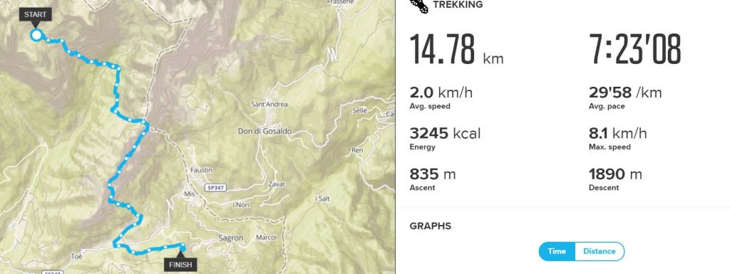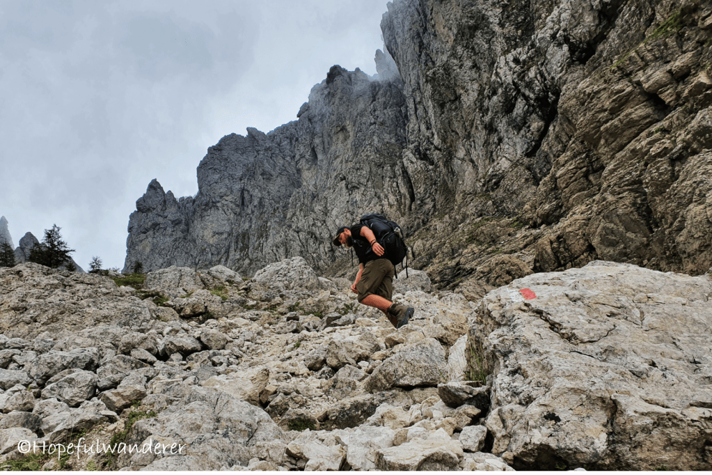 Noc na trávě v zakletém údolí pod masivem Cima Canali byla příjemná. Vlastně to dost možná byla ta nejlepší noc ze všech. Ráno je ovšem frišné. Pomalu se balíme a vyrážíme dál na cestu. Čeká nás teď asi kilometrový sestup. Člověk by se zaradoval, že si alespoň odpočine…až na to, že dolu to snad bolí ještě víc než nahoru. Především moje koleno si to vyloženě užívá.