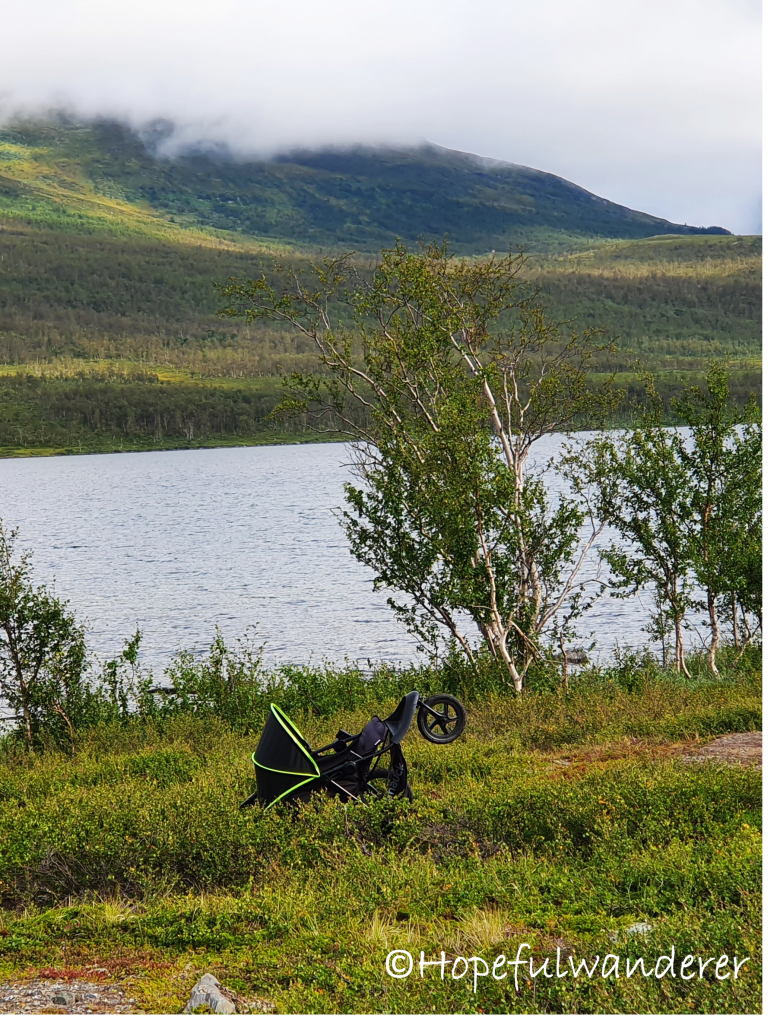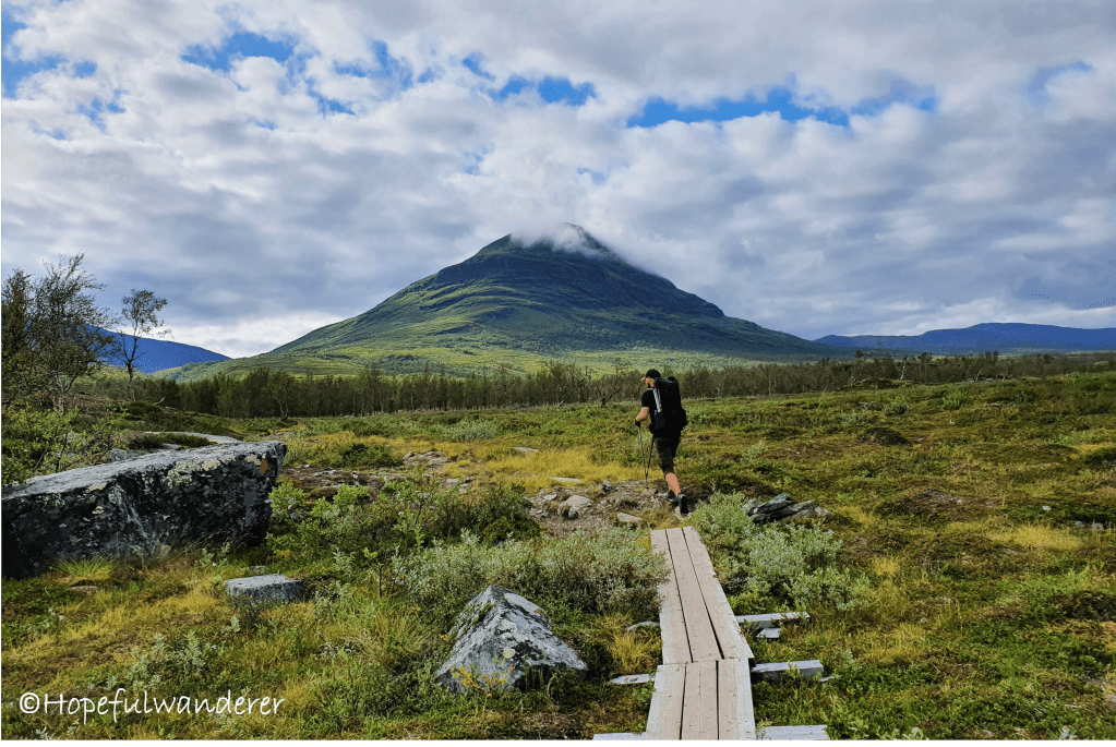 Hned od rána nás cesta vede po příjemných rovinkách a dřevěných chodníčcích. Míjíme hned několik stanů, ve kterých se ještě spí. Stanovat tady lze téměř kdekoli (s výjimkou oblasti samotného Národního Parku Abisko, kde by se mělo tábořit pouze na dedikovaných místech). Je to pro nás opravdu nezvyk potkávat tolik spřízněných duší. Většinou chodíme trasy, které jsou o poznání méně frekventované. Docela si ale setkání s jinými hikery užíváme. Je to vcelku příjemný “komunitní” zážitek. Většina lidí je, stejně jako my, teprve na začátku svého putování, takže nálada je obecně skvělá, úsměvy se to všude jen hemží.