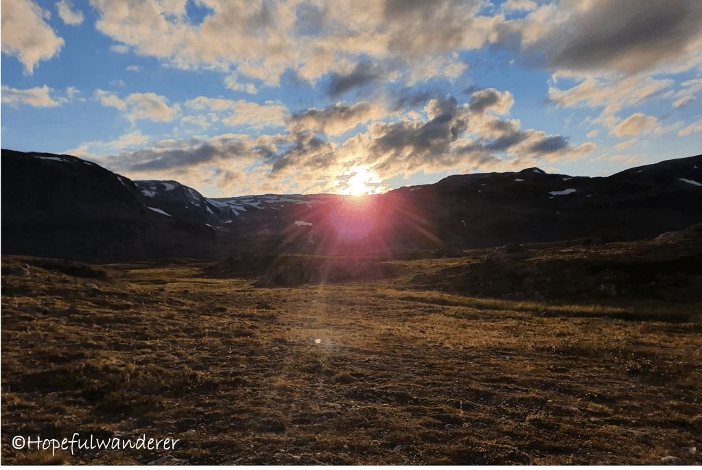 Večer pozoruju západ slunce za nedalekým kopcem. V dáli hučí vodopád. A nedaleko mě pobíhají hned 2 stádečka sobů. Je to strašně kouzelný.