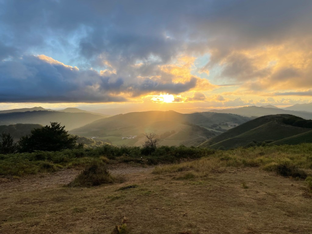 Celé odpoledne jdeme víceméně do kopce. Poslední kilometr už je vcelku kritický a tak to zapichujeme na jakš takž rovném plácku přímo u cesty v půlce kopce. Je odtud krásný výhled na baskické kopce i na oceán.