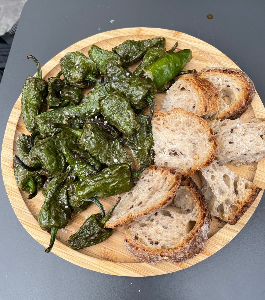 Po nákupu následuje návštěva místní baro-restaurace, kde vdechneme smažený mušle v těstíčku, grilovaný papričky Padrón a k tomu lahev Riojy.
