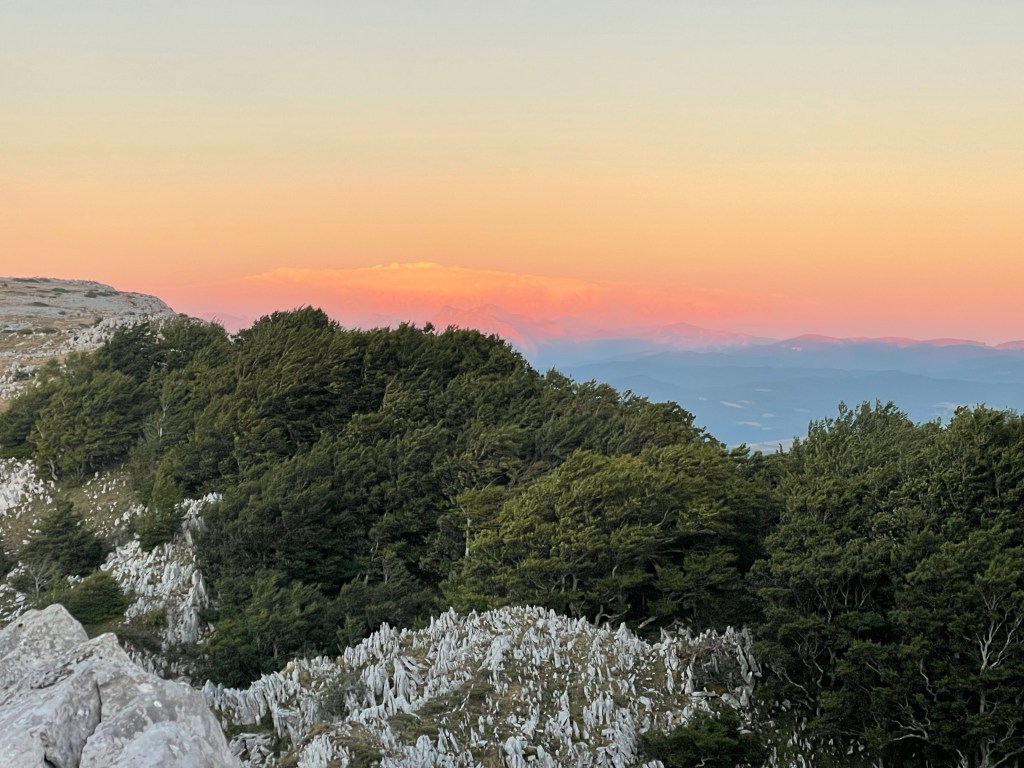 Ještě před vstupem do koňsko-kravské ohrady nacházíme perfektní plácek na stan s parádním výhledem. Pozorujeme mraky valící se přes blízký hřeben jako mořská vlna . Zapadající slunce nám pak dopřeje barevný koncert. Hřebeny na obzoru se mění z šedivých na tyrkysové, bílé až oranžovo-růžové. V pozadí řvou krávy…