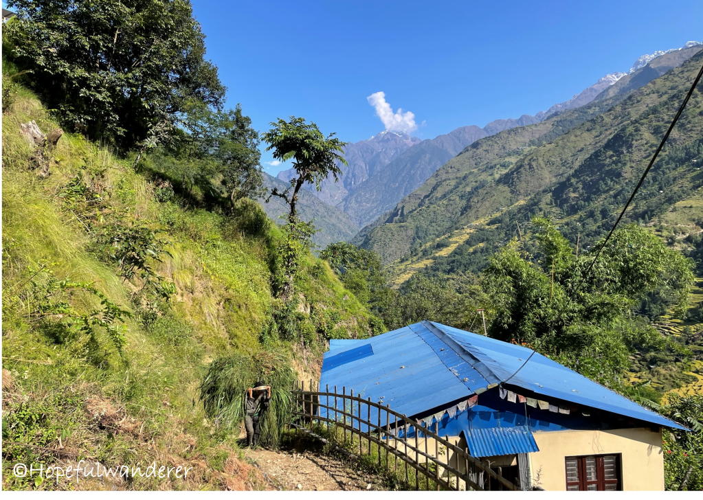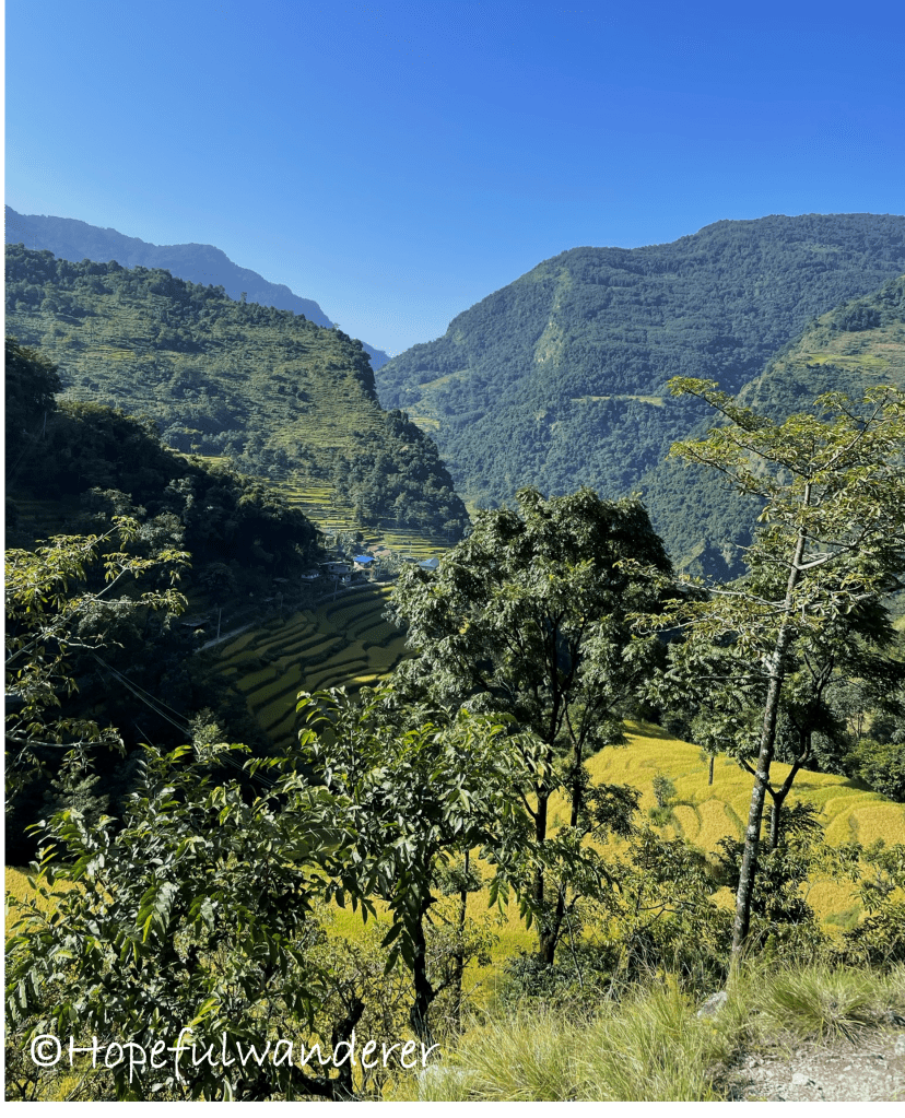 Po té, co spořádáme obří nálož ovesné kaše s banánem k snídani, vyrážíme na cestu. Čeká nás nejprve lehké, později už poměrně prudké stoupání po kamenných schodech až do brahmánské vesnice Bahundanda. Jsou odtud opravdu parádní výhledy.