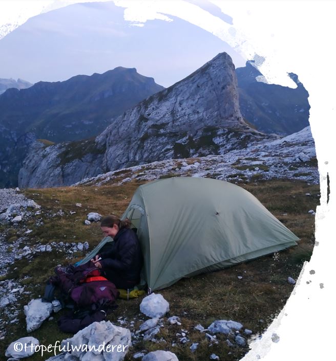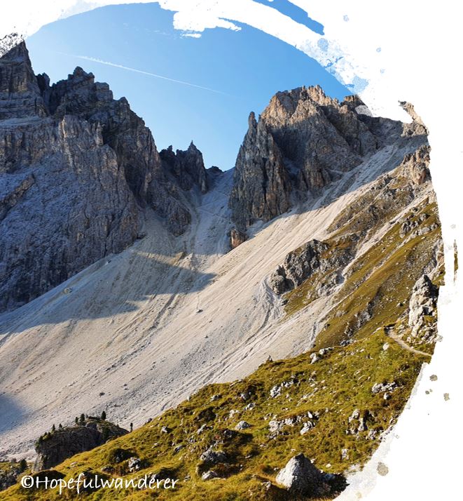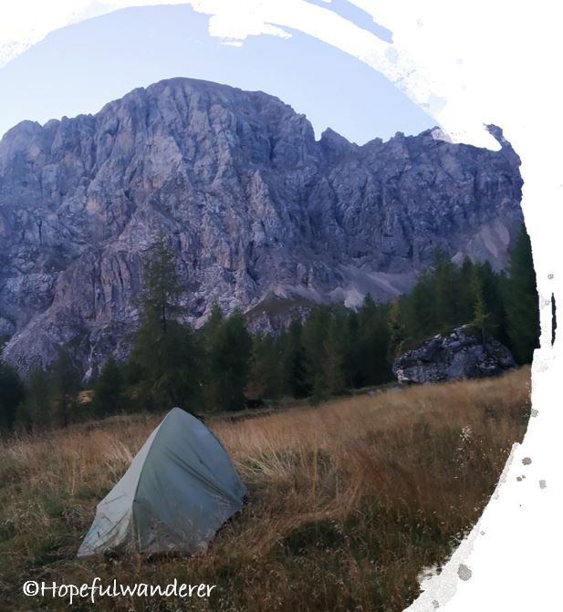 Tady v Dolomitech se zjevně rozednívá poměrně brzy. Budíme se už kolem 7.hodiny ranní. Chceme se co nejdříve sbalit a vyrazit na cestu. Noc byla klidná a i přes to, že jsme lehce sjížděli ze svahu, jsme se vyspali docela dobře. Ke snídani si kromě tyčinky a kávy vychutnávám i pohled na skalní masiv tyčící se naproti nám. Všimnu si pěšinky klikatící se vzhůru přímo do sedla protějšího svahu. “No do háje...